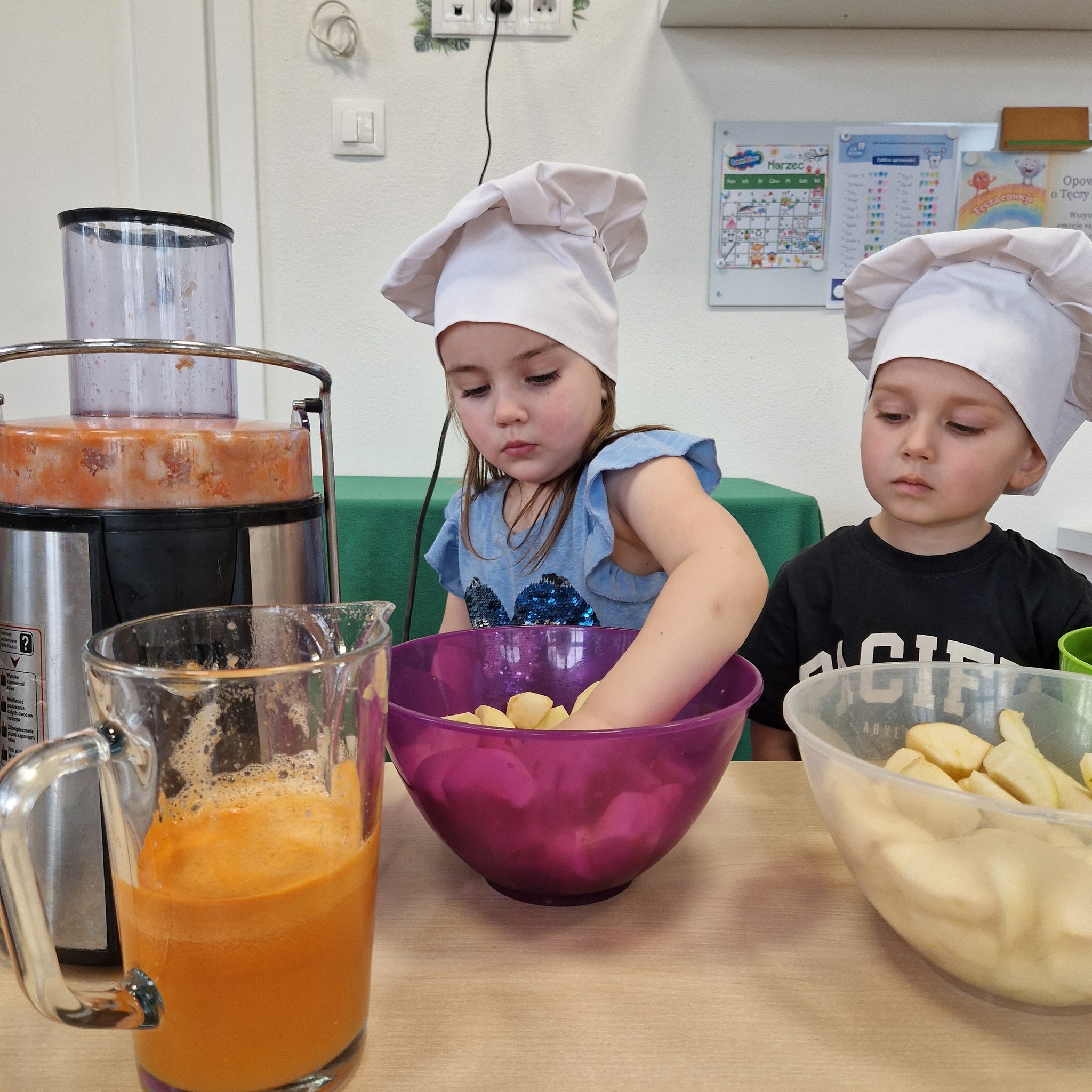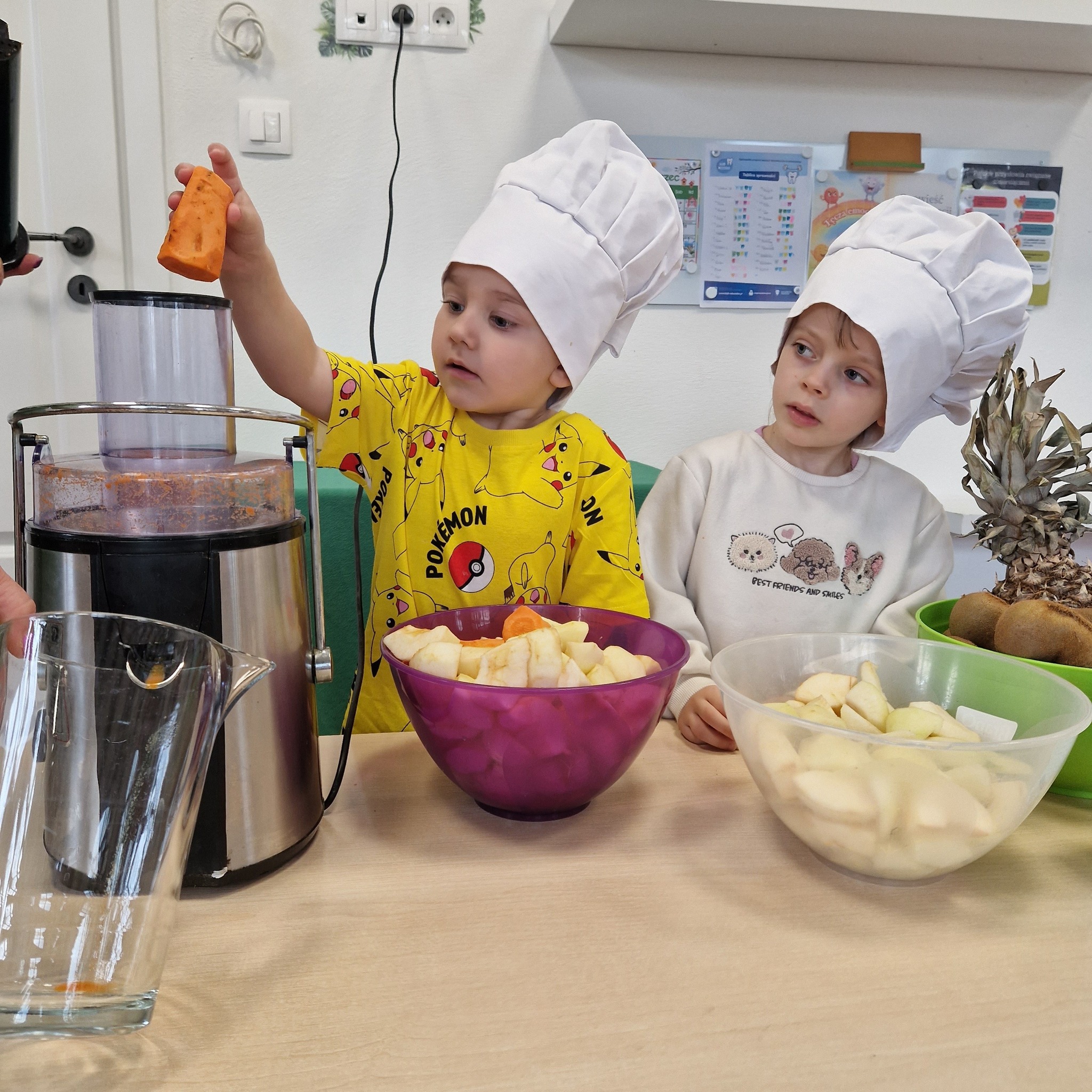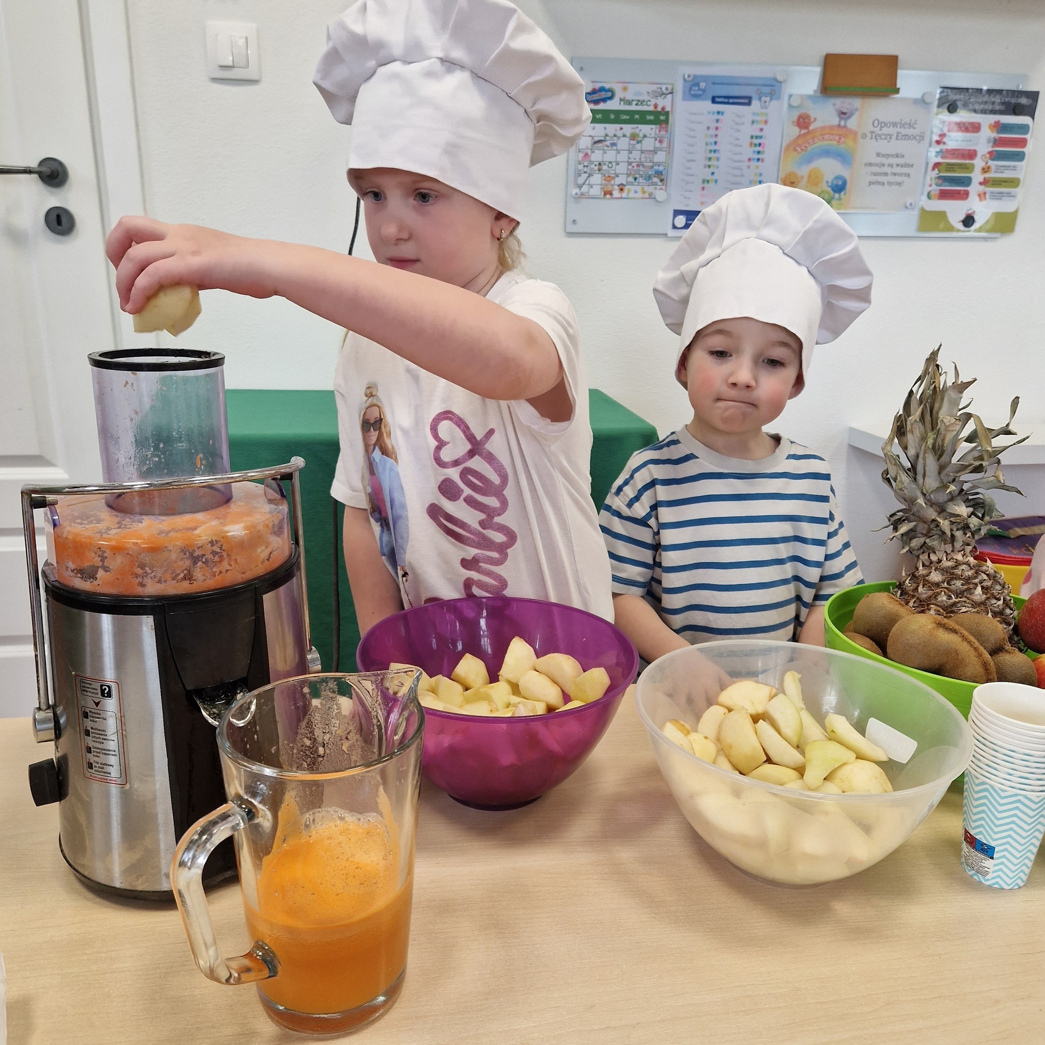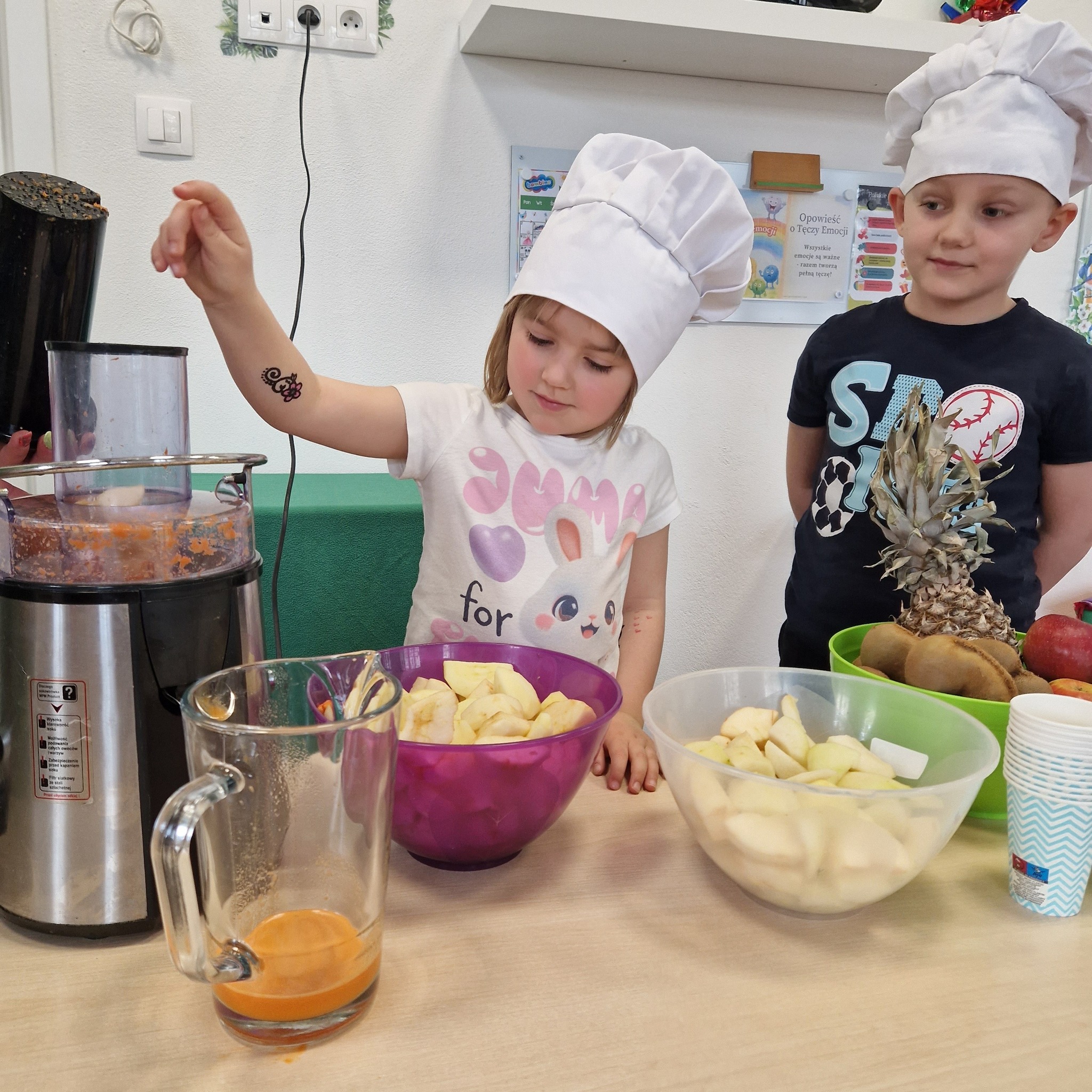Po zajęciach nasze przedszkolaki zamieniły się w małych odkrywców zdrowia! Wspólnie przygotowaliśmy świeży, pyszny sok owocowy, dzięki któremu dzieci mogły nie tylko zadbać o swoje zdrowie, ale także bliżej poznać świat witamin. Podczas zajęć dzieci doświadczały wszystkiego wielozmysłowo – dotykały owoców, poznawały ich zapach i smak oraz obserwowały cały proces powstawania soku. To była nie tylko smakowita zabawa, ale również cenna lekcja o tym, jak ważne jest zdrowe odżywianie.