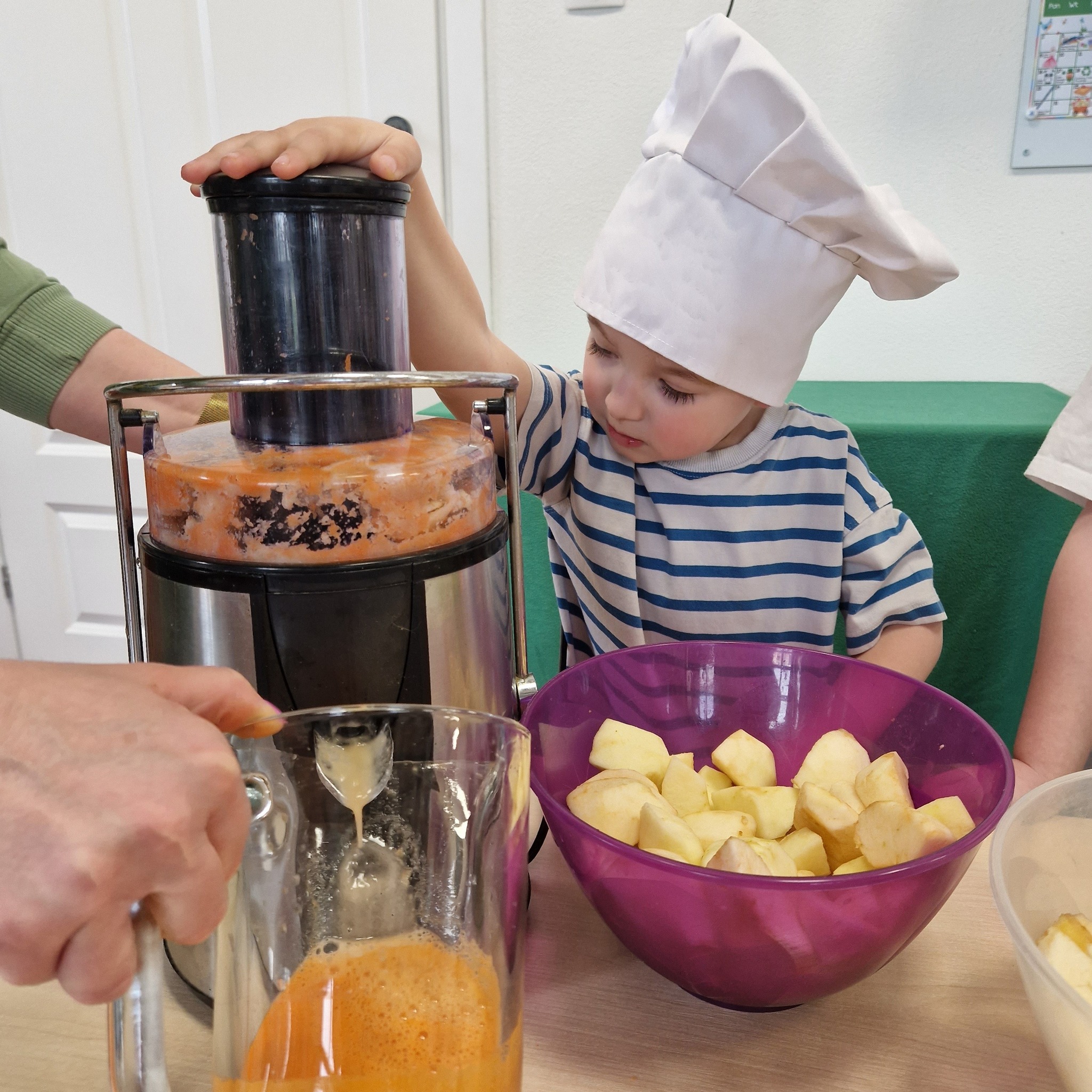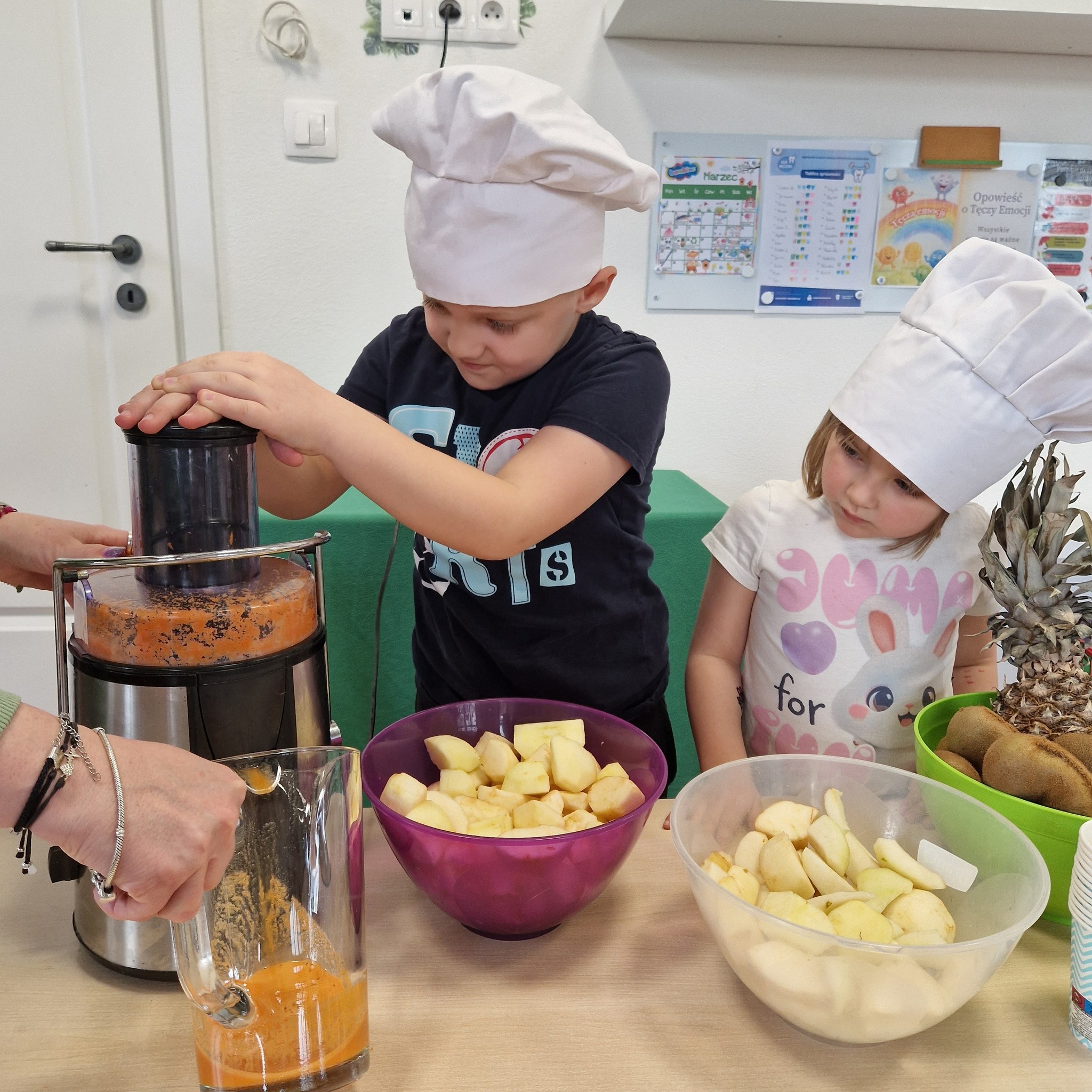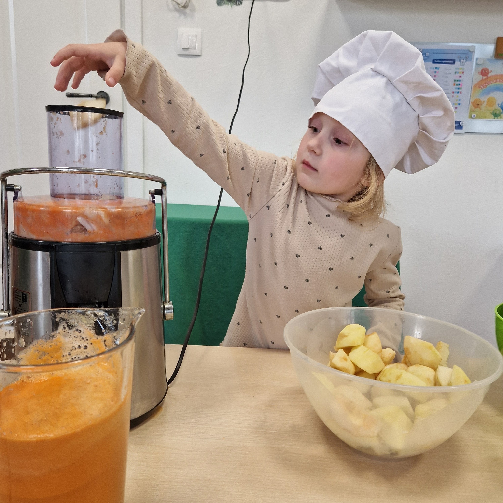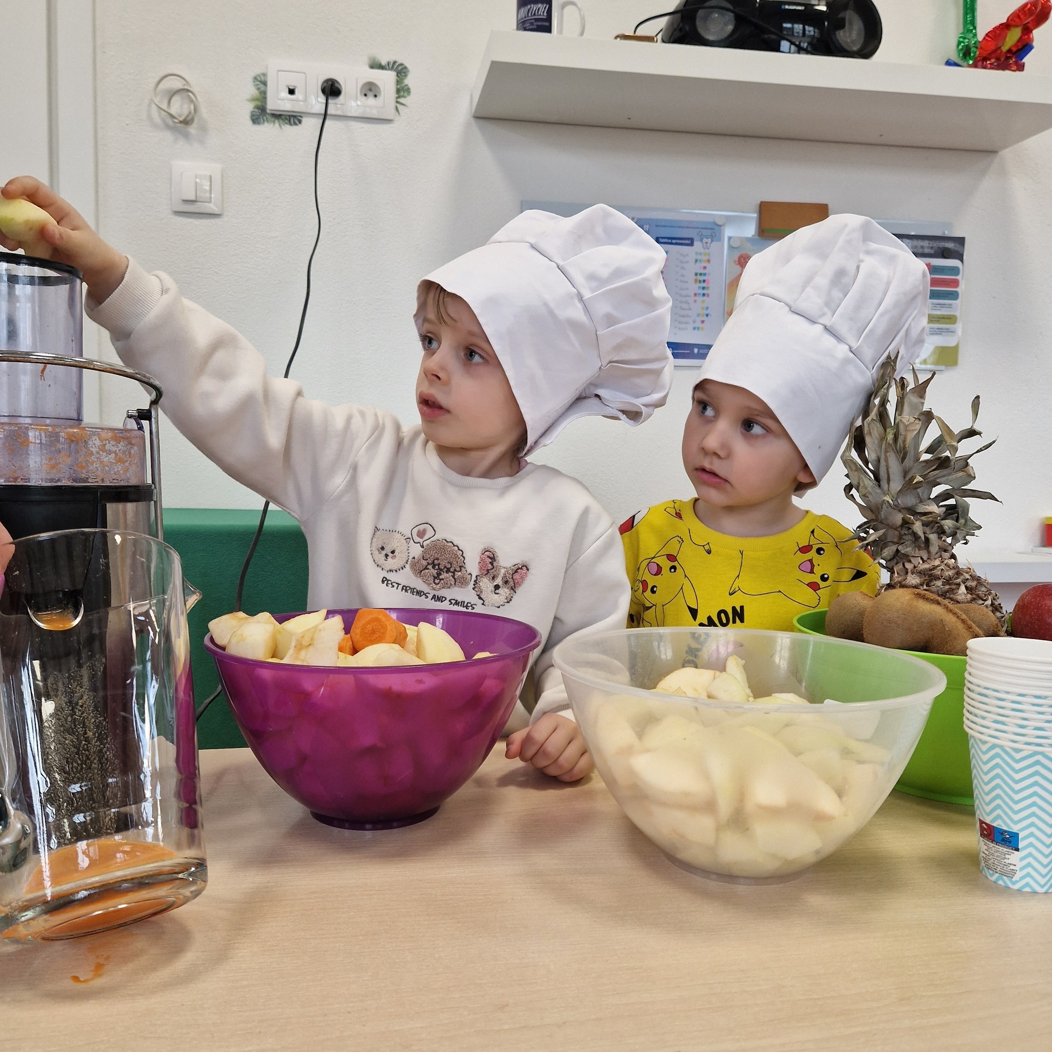 Po zajęciach nasze przedszkolaki zamieniły się w małych odkrywców zdrowia! Wspólnie przygotowaliśmy świeży, pyszny sok owocowy, dzięki któremu dzieci mogły nie tylko zadbać o swoje zdrowie, ale także bliżej poznać świat witamin. Podczas zajęć dzieci doświadczały wszystkiego wielozmysłowo – dotykały owoców, poznawały ich zapach i smak oraz obserwowały cały proces powstawania soku. To była nie tylko smakowita zabawa, ale również cenna lekcja o tym, jak ważne jest zdrowe odżywianie.